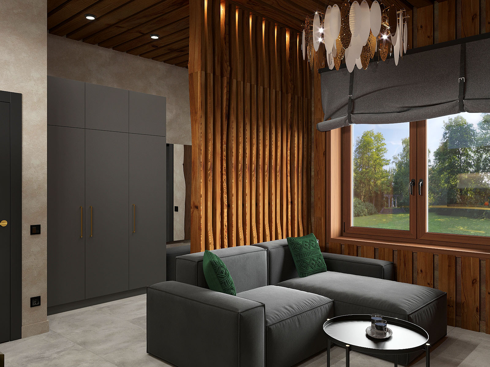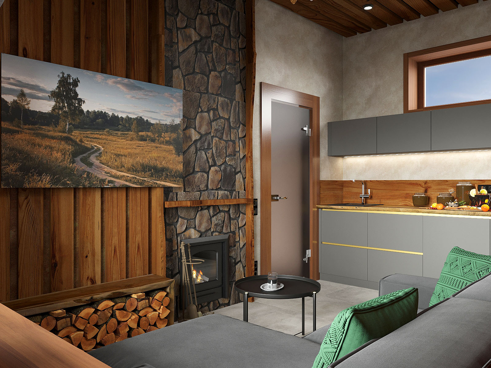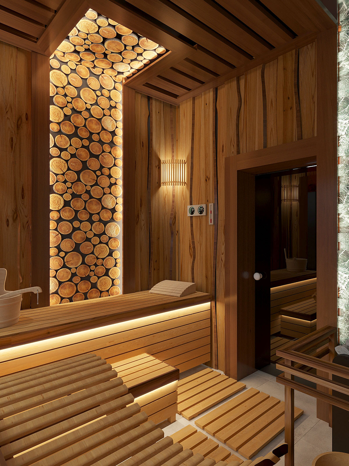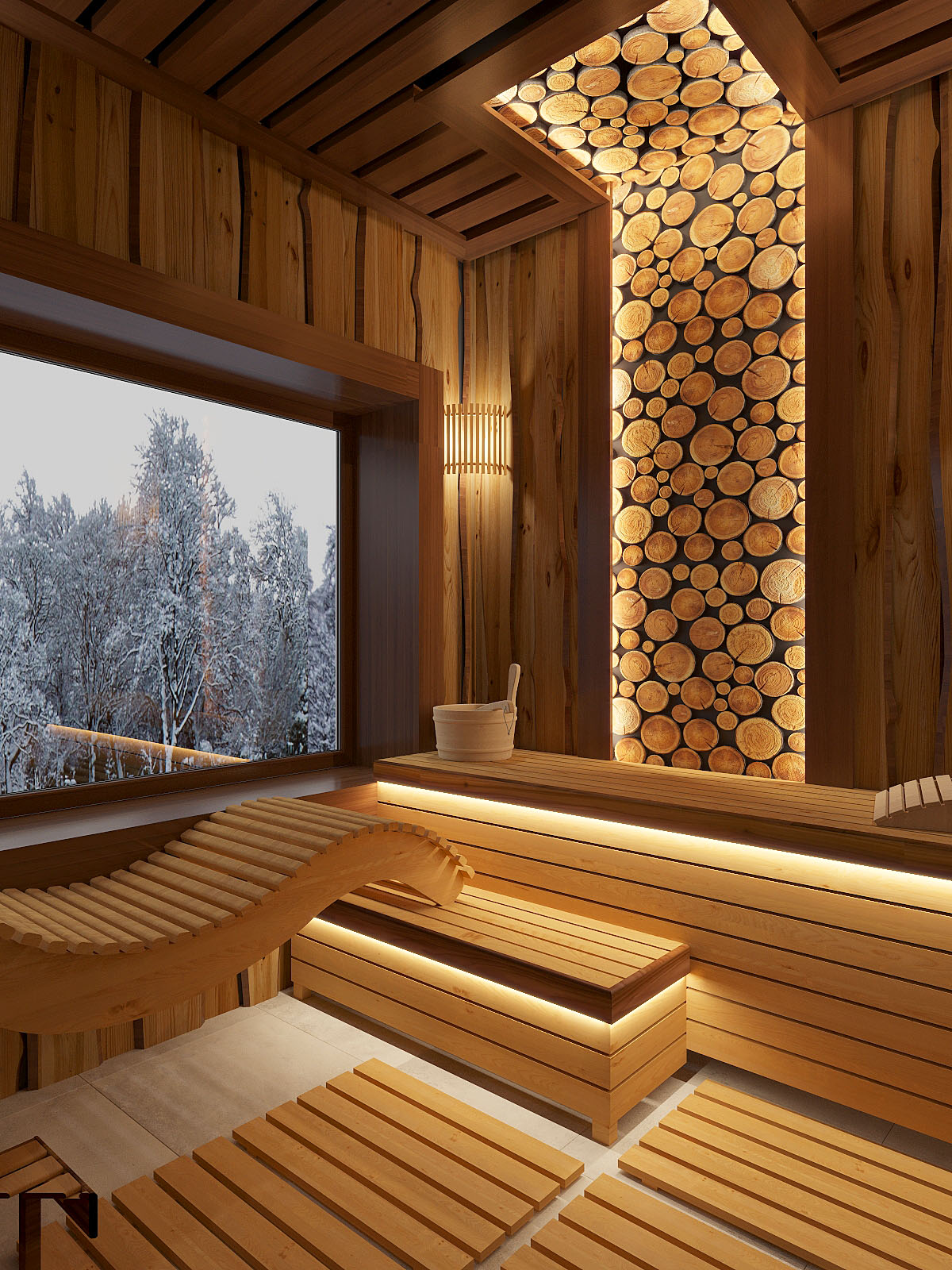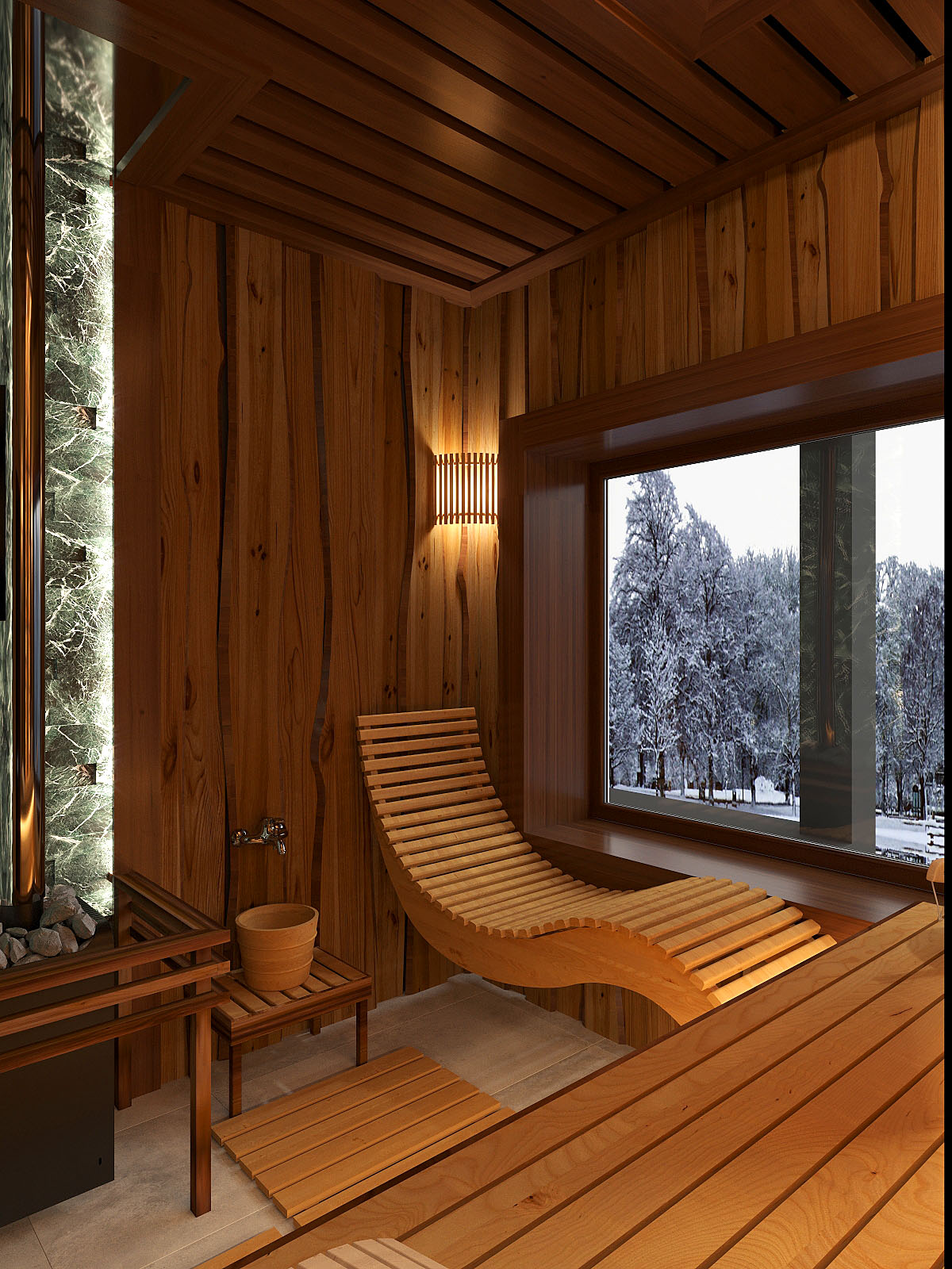 В парной и комнате отдыха проекта загородной бани царит волшебная атмосфера, где тепло дерева встречается с пейзажем за большим окном. Мягкий свет, льющийся изнутри, подчеркивает текстуру древесины и создает уютное сияние.