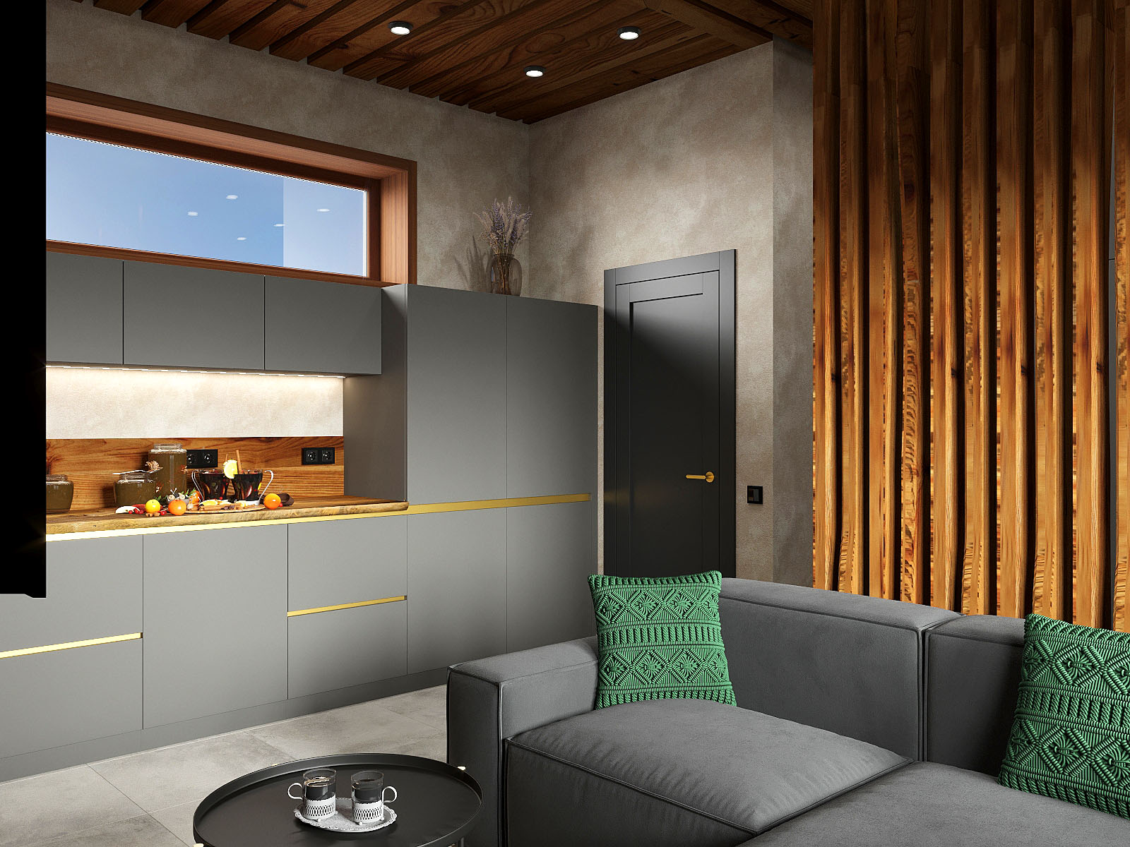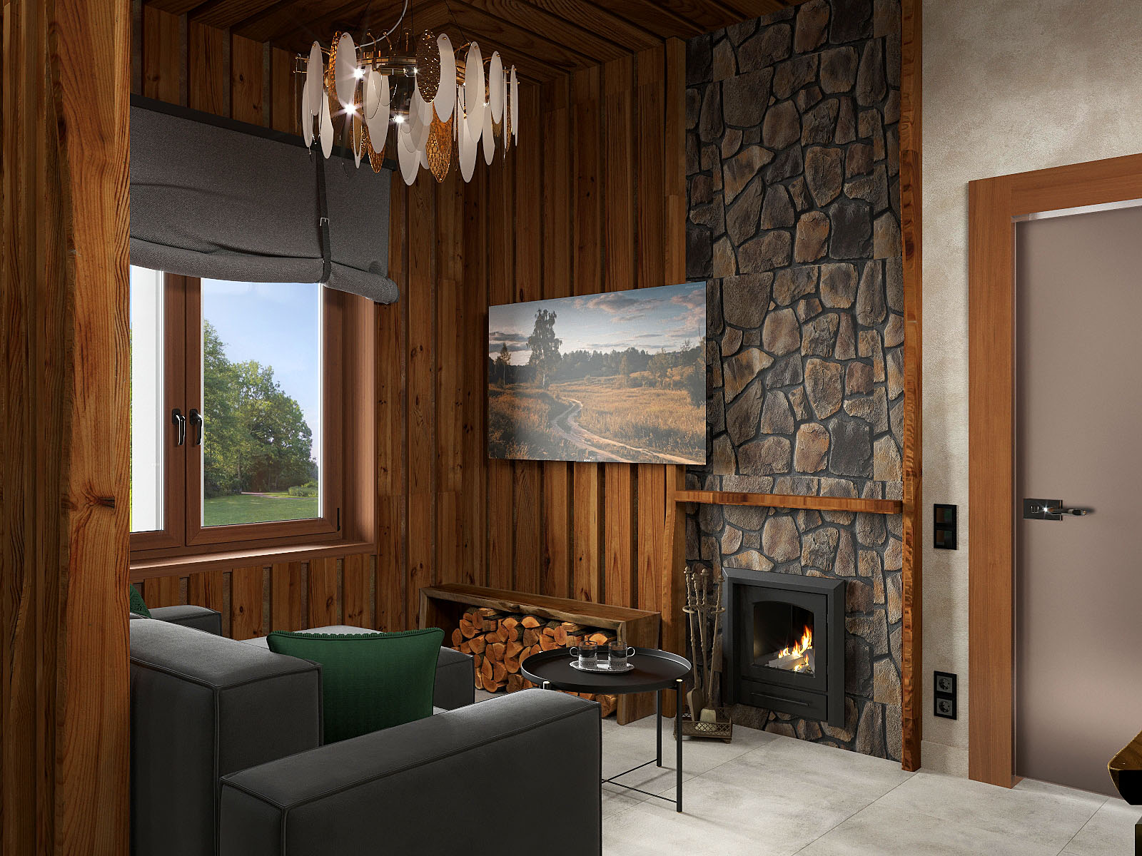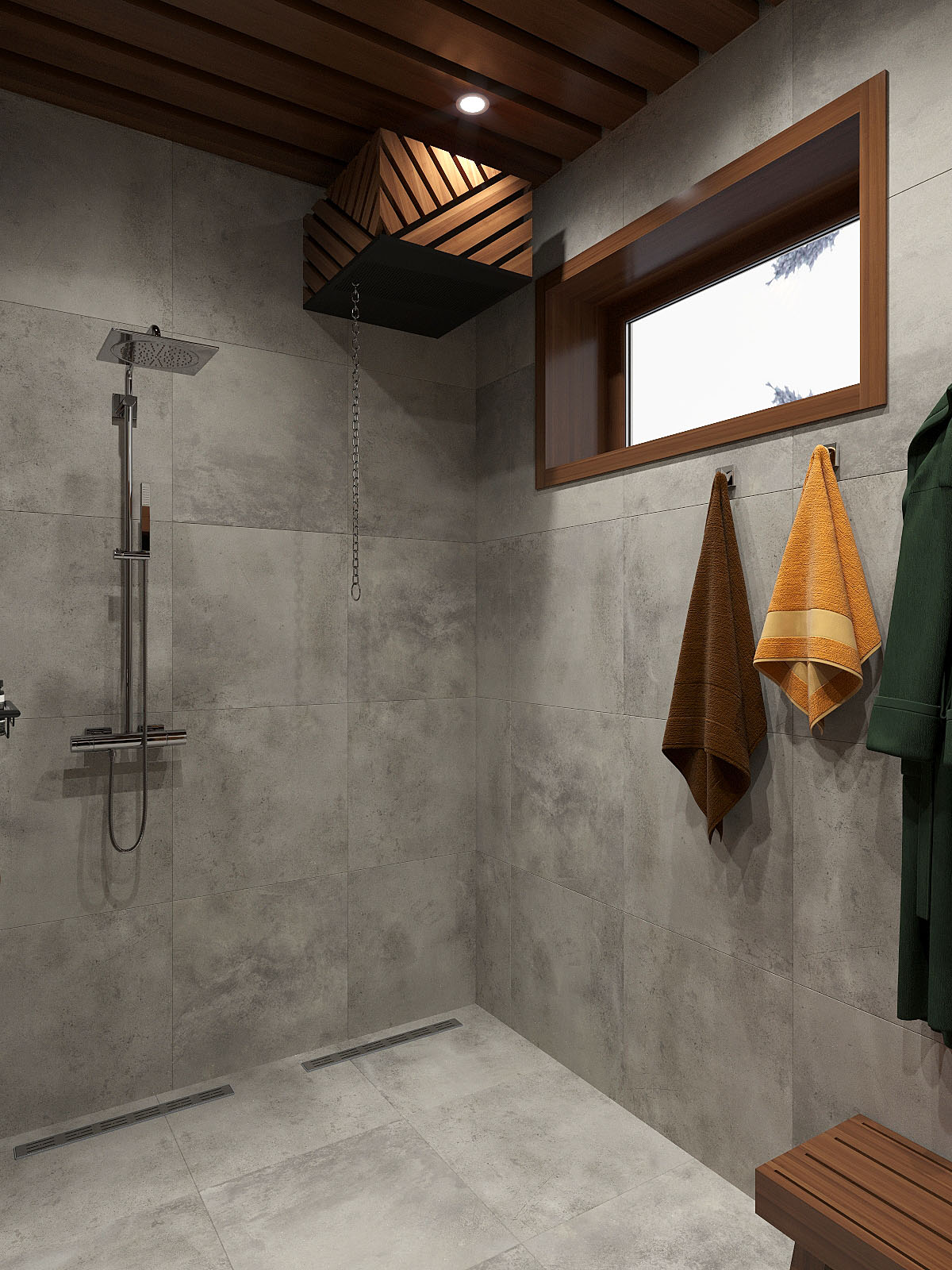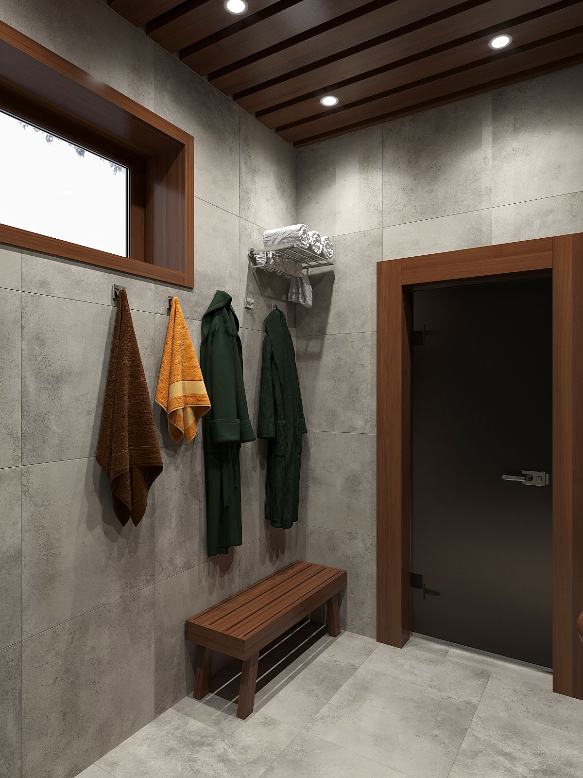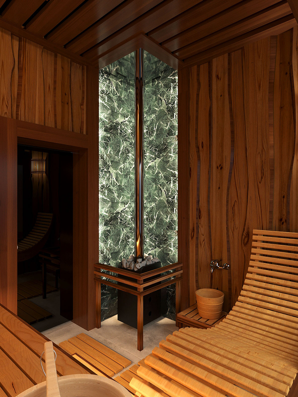 В парной и комнате отдыха проекта загородной бани царит волшебная атмосфера, где тепло дерева встречается с пейзажем за большим окном. Мягкий свет, льющийся изнутри, подчеркивает текстуру древесины и создает уютное сияние.