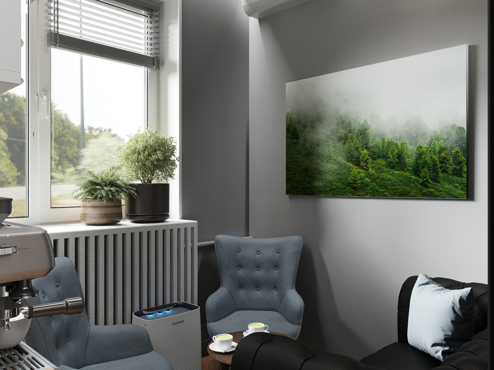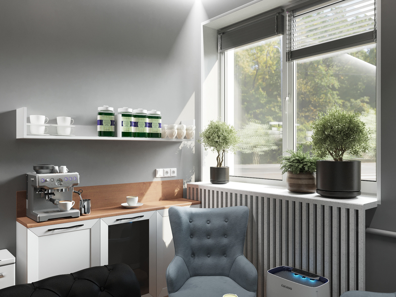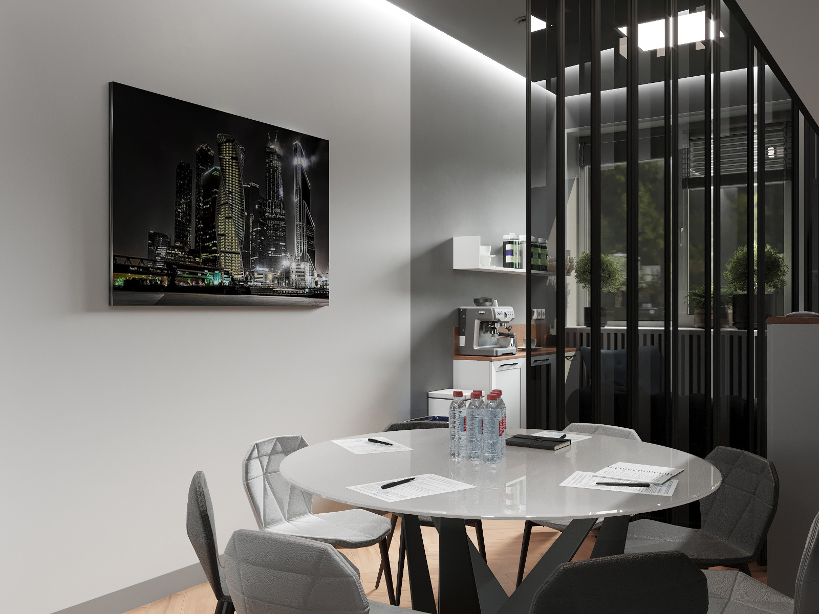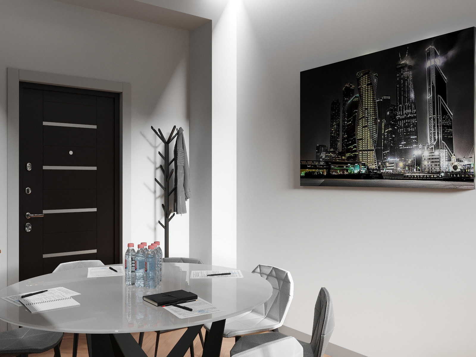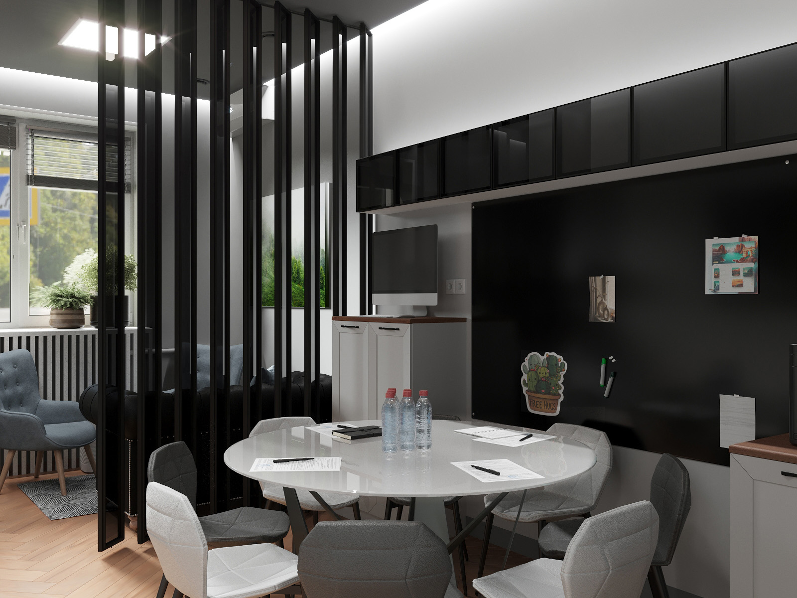 Современное и стильное сочетание серых оттенков с белыми акцентами создает рабочую атмосферу, не отвлекающую от процесса. Небольшое помещение разделено на две зоны: рабочую и место для неформального общения. В рабочей можно продуктивно провести совещания и обсуждение с коллегами текущих моментов и поработать за компьютером.