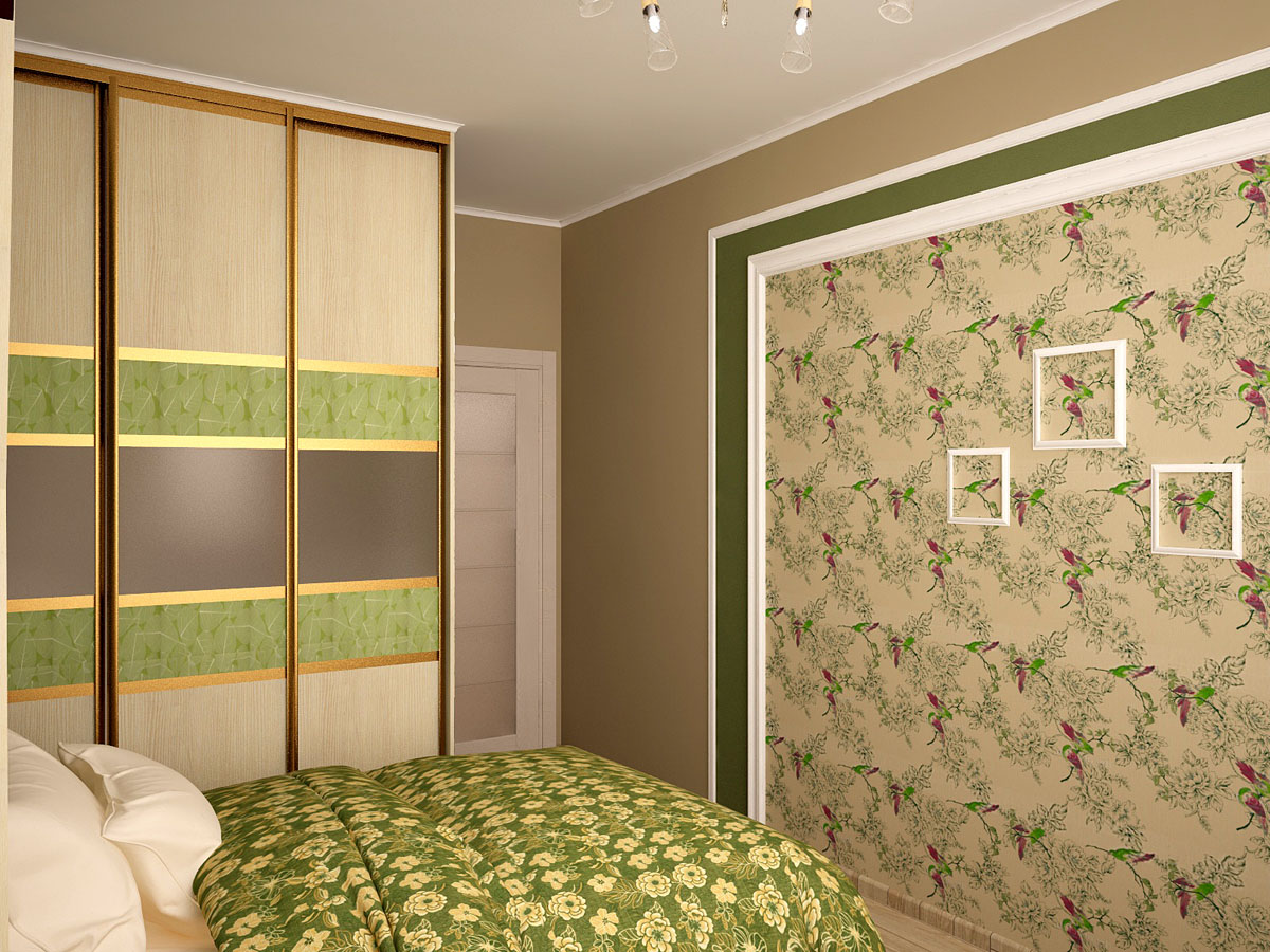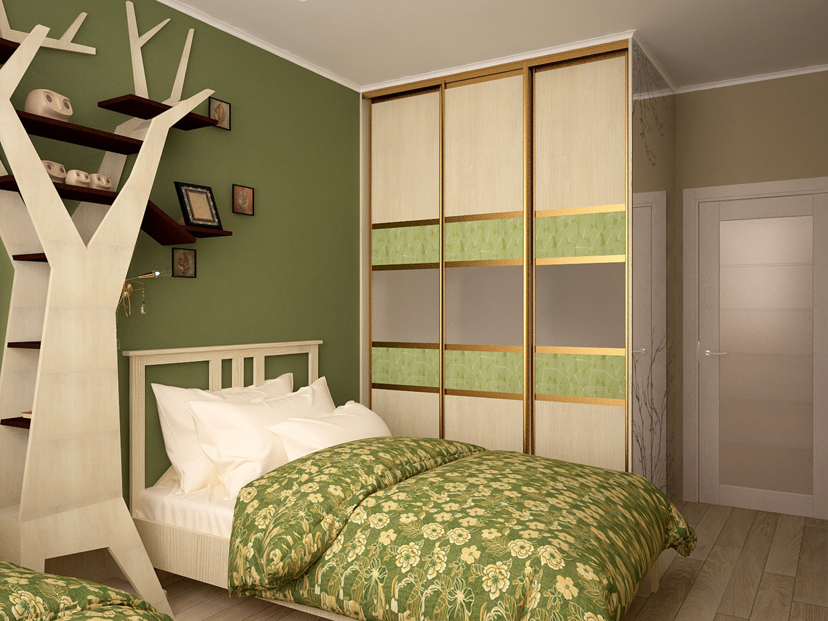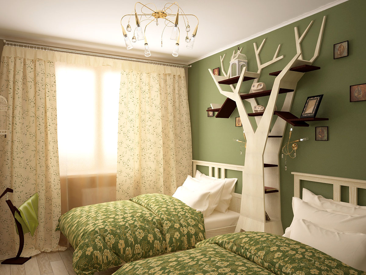 Спальня же выступает уголком спокойствия и умиротворения в бурном море творческой энергии - приятные фисташковые и бежевые тона, обои с райскими птицами и даже здесь не обошлось без сюрприза - собственное дерево в квартире. Кто об этом не мечтает?