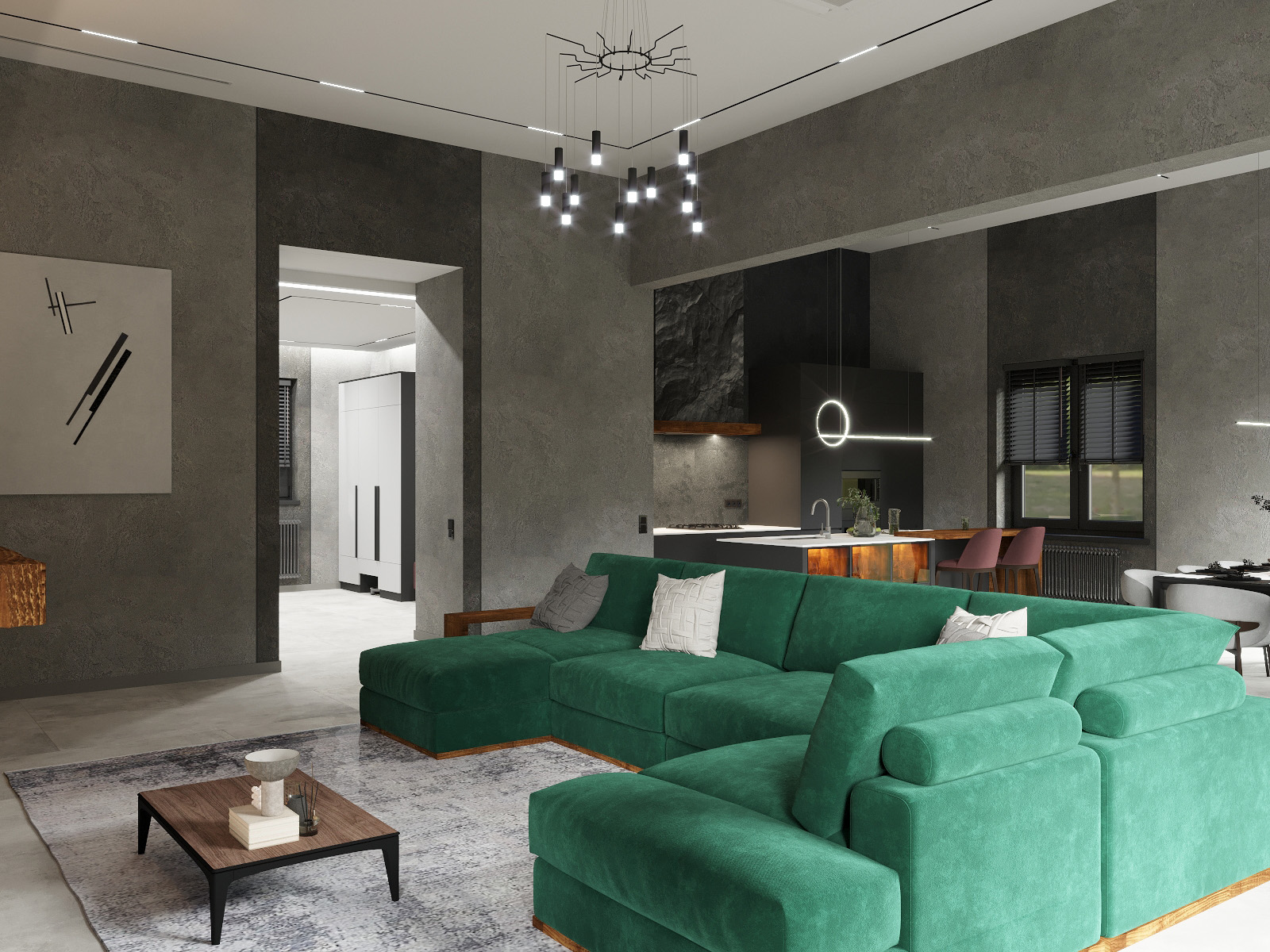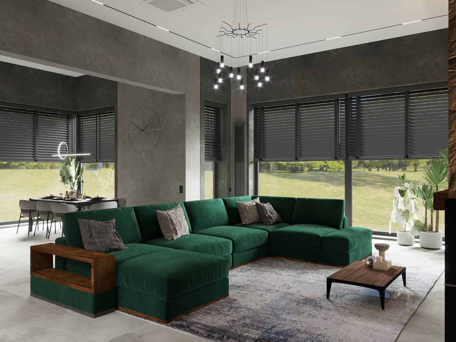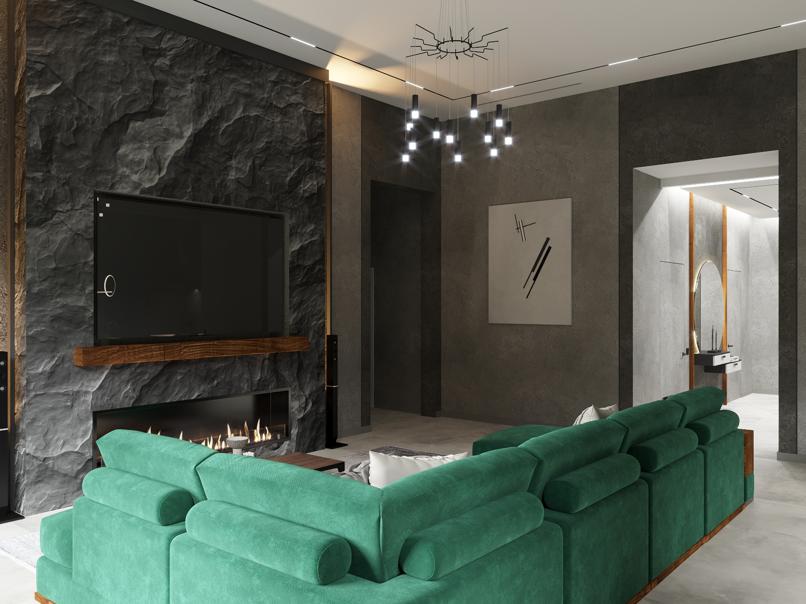 Этот интерьер просто восхитителен! Современная гостиная с большим зелёным секционным диваном выглядит невероятно стильно. Тёмные стены с текстурированной каменной отделкой вокруг встроенного камина добавляют шик и уют. Над камином расположен огромный телевизор, создающий атмосферу домашнего кинотеатра. Огромные окна с чёрными жалюзи позволяют наслаждаться естественным светом, а изящные комнатные растения добавляют свежести. Ультрасовременная люстра с множеством подвесных светильников придаёт пространству элегантность и изысканность. Светлый пол идеально завершает этот потрясающий современный дизайн!