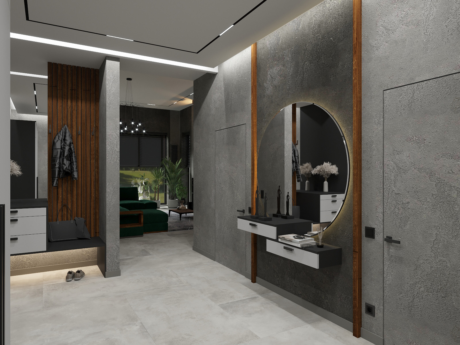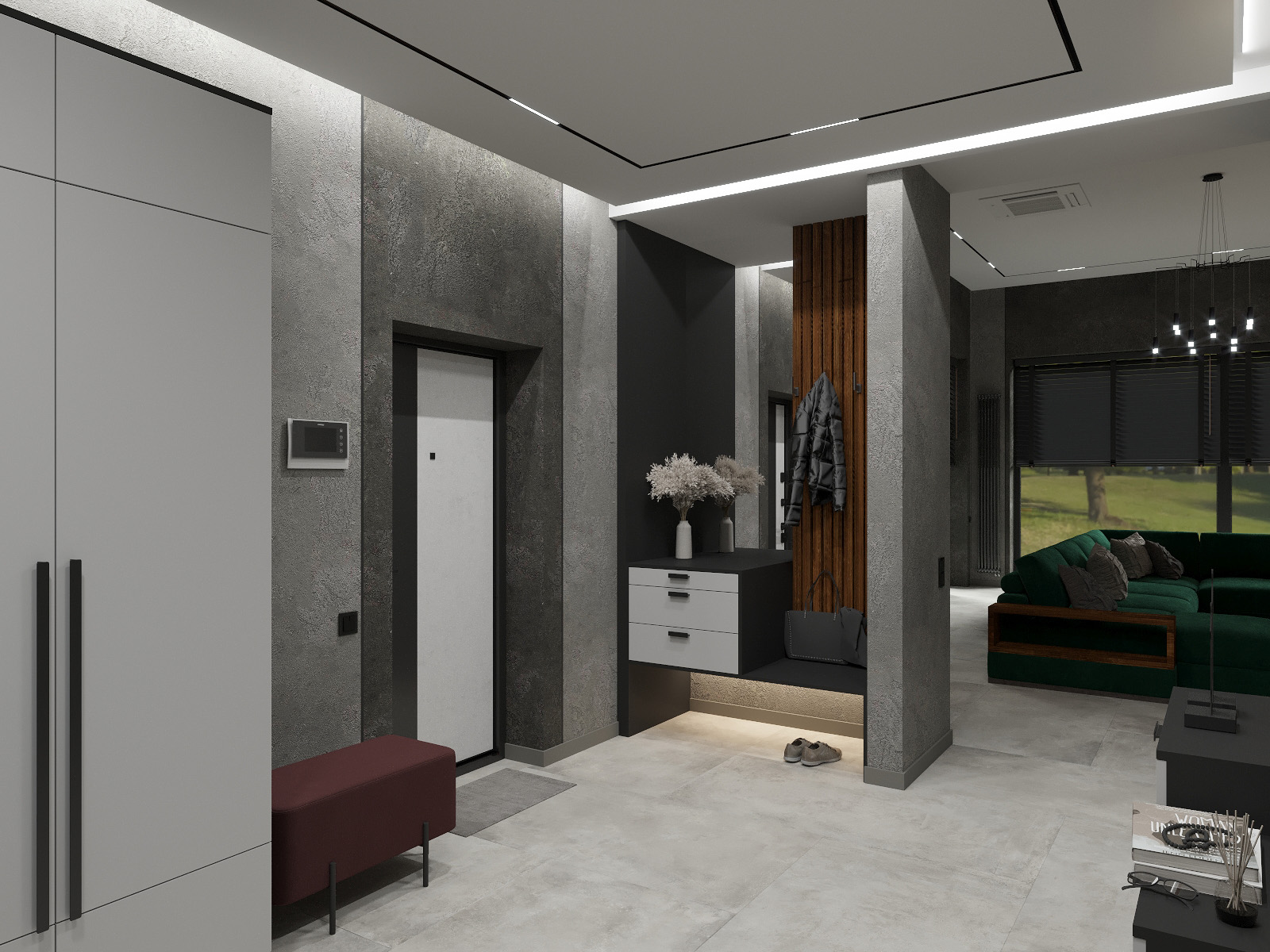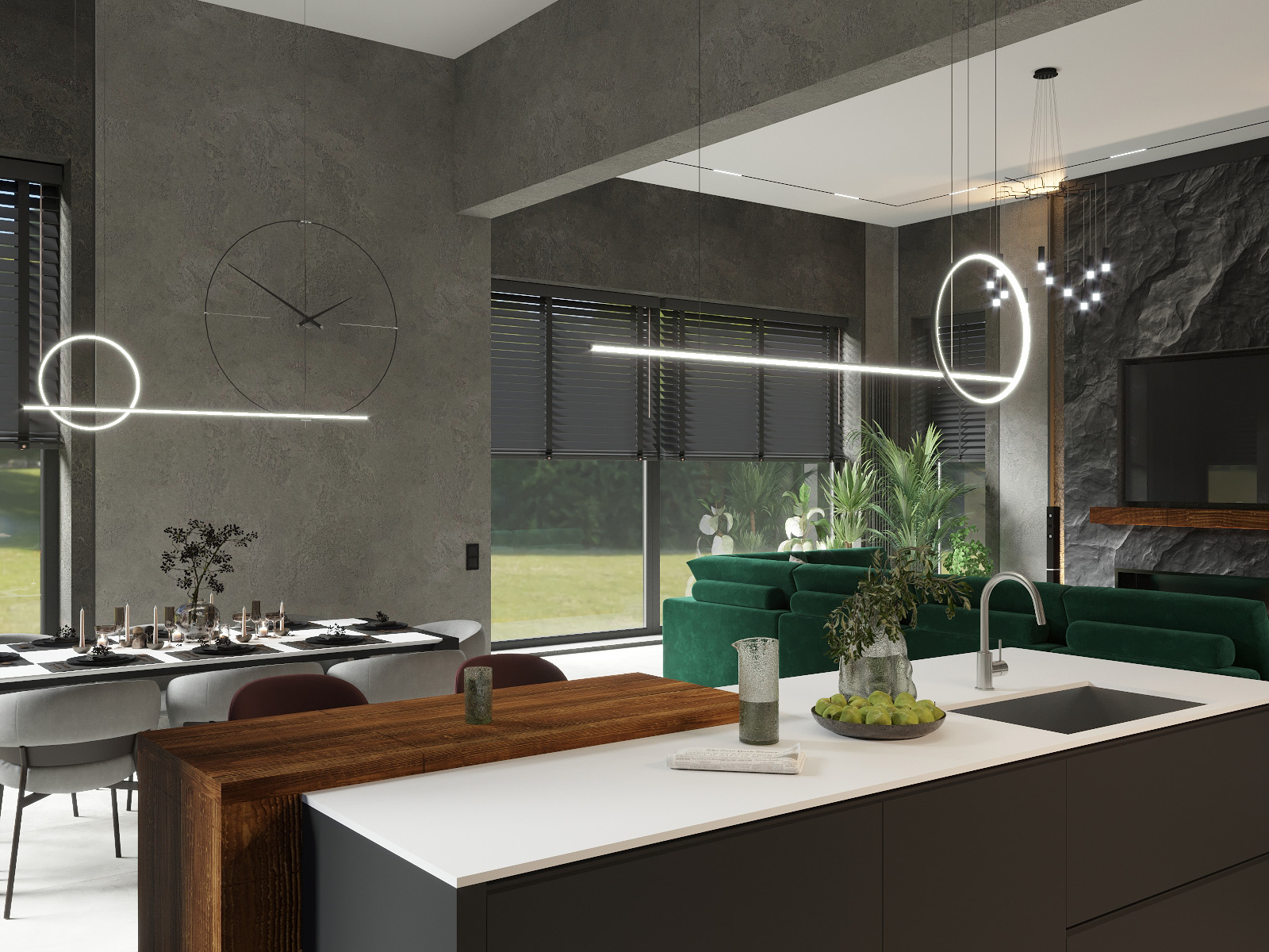 Этот интерьер просто восхитителен! Современная гостиная с большим зелёным секционным диваном выглядит невероятно стильно. Тёмные стены с текстурированной каменной отделкой вокруг встроенного камина добавляют шик и уют. Над камином расположен огромный телевизор, создающий атмосферу домашнего кинотеатра. Огромные окна с чёрными жалюзи позволяют наслаждаться естественным светом, а изящные комнатные растения добавляют свежести. Ультрасовременная люстра с множеством подвесных светильников придаёт пространству элегантность и изысканность. Светлый пол идеально завершает этот потрясающий современный дизайн!