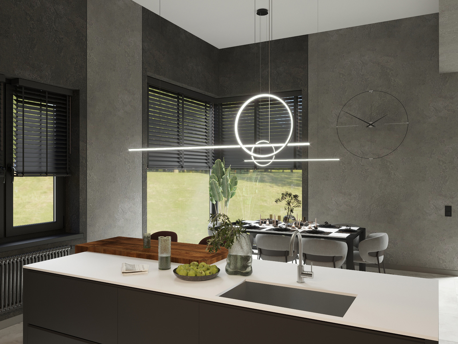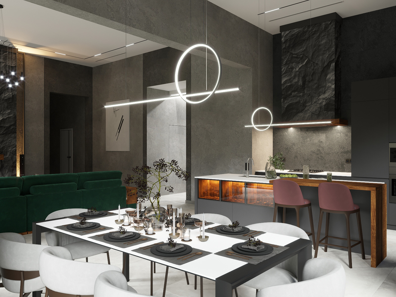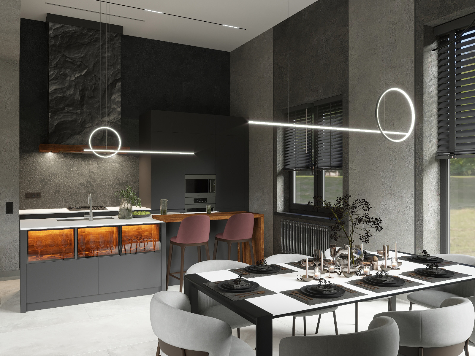 В дополнение к стильной гостиной, кухня также впечатляет своим современным дизайном. Тёмные стены продолжают тему из гостиной, создавая единое пространство. Кухонный остров с подсветкой и барными стульями добавляет функциональности и стиля. Современные приборы и минималистичный декор подчёркивают изысканность интерьера. Обеденный стол сервирован с утончённой элегантностью, а подвесные светильники над ним добавляют футуристический акцент. Это пространство идеально подходит для уютных вечеров и стильных ужинов!