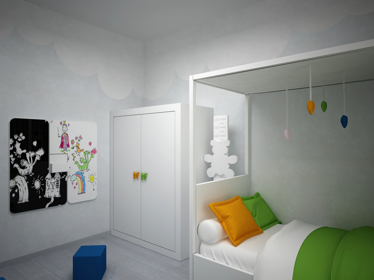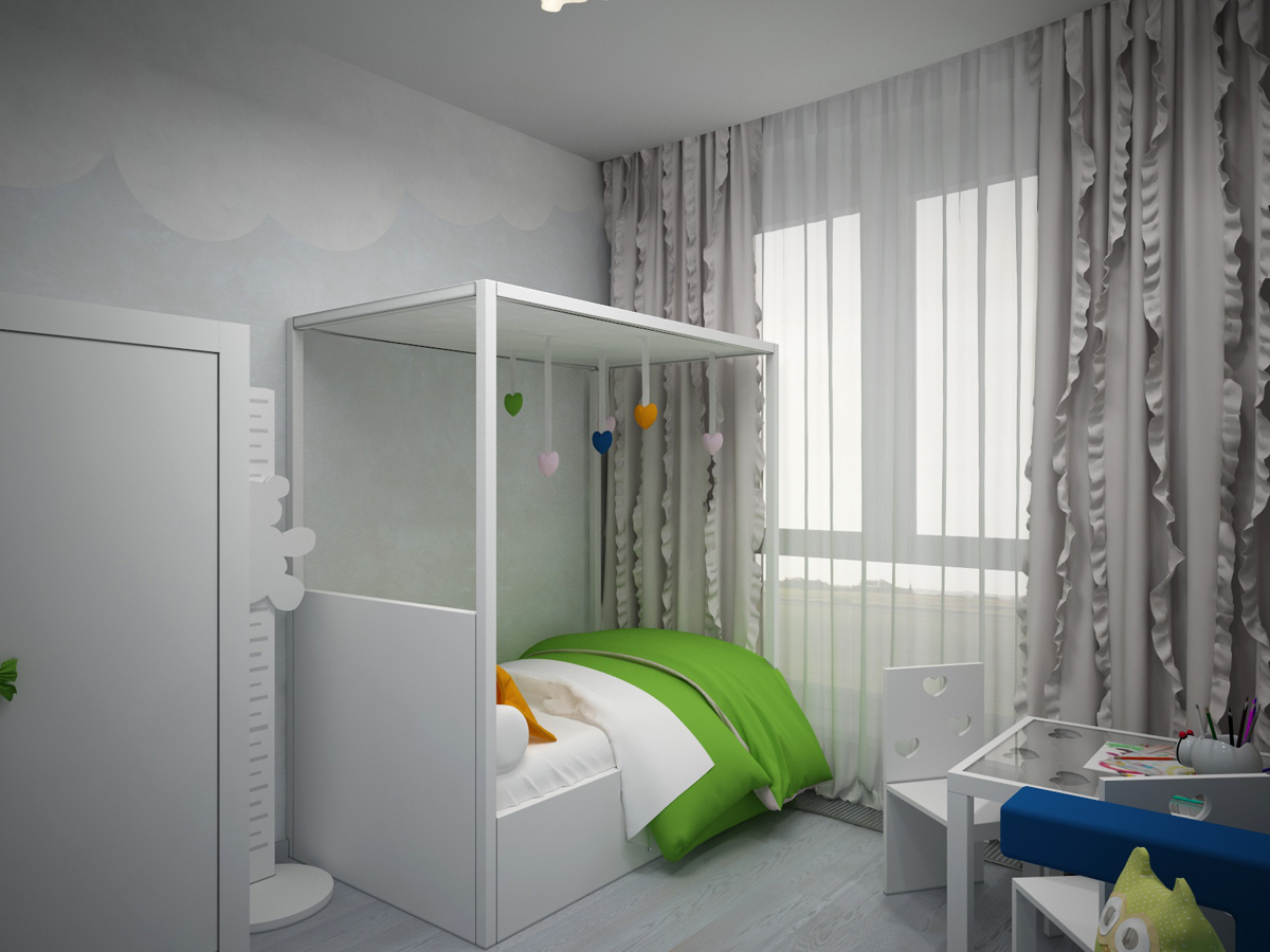 Изначально помещение было свободно от перегородок, поэтому площадь квартиры практически полностью была отдана под общественную зону – гостиную, объединенную с кухней и столовой. Также квартира включает в себя спальню, детскую, ванную комнату и гостевой санузел. В просторном холле нашлось место вместительному гардеробному шкафу.